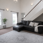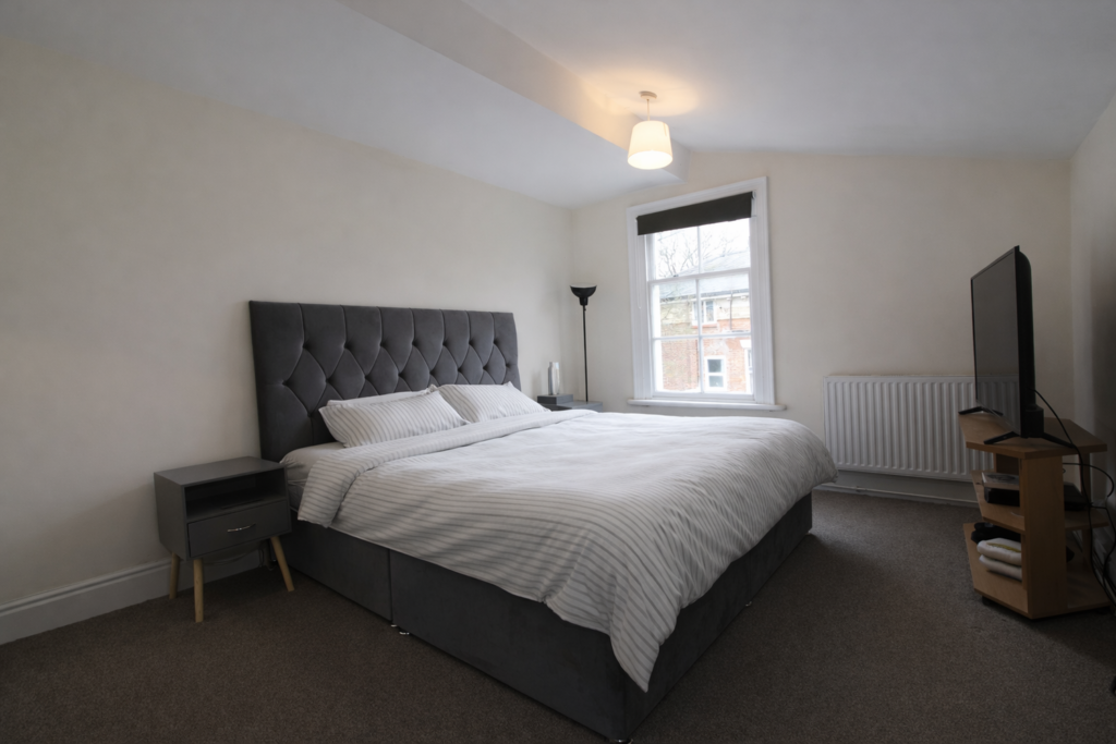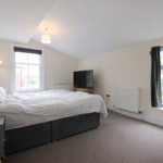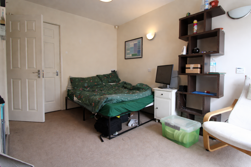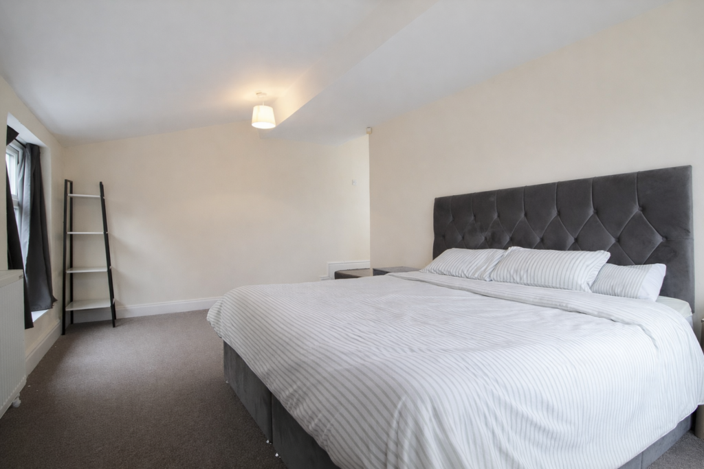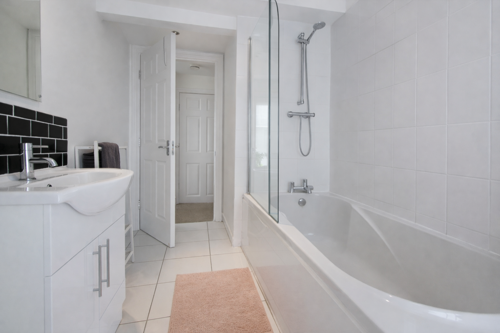 There are three well-sized bedrooms, with the main bedroom benefiting from its own en-suite shower room. The main bathroom is finished with a clean white suite, maintaining the fresh and neutral aesthetic carried throughout the apartment. The property has lots of storage space and accessible loft storage.