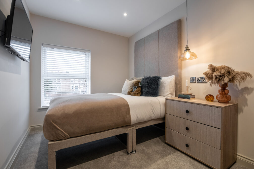 The room has a modern en-suite shower room and comes fully furnished with a double bed, wardrobe, drawers, TV , desk, and chair.