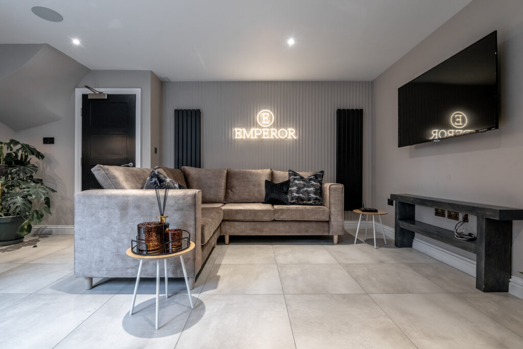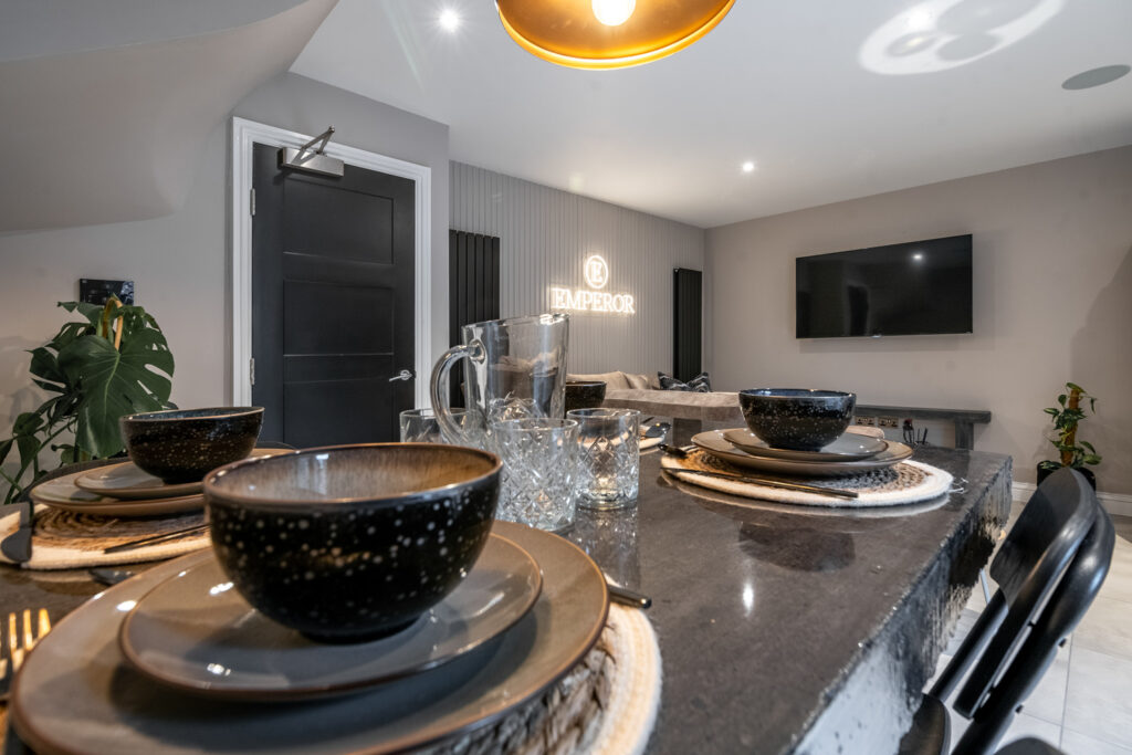 Living Area – Modern, spacious with Smart TV and integrated Bluetooth surround sound speakers.