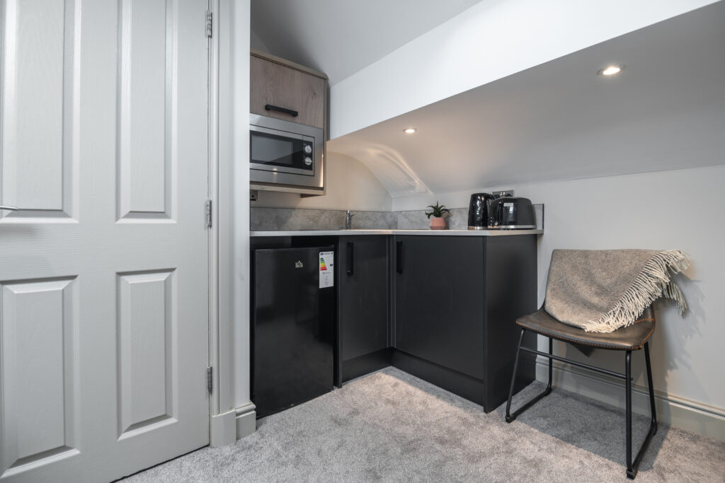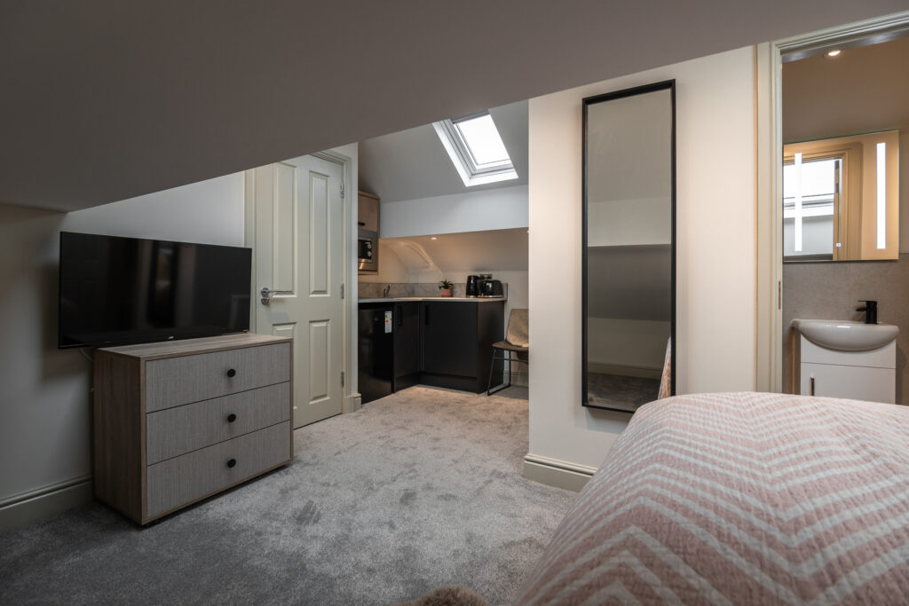 The studio is fully furnished with a double bed, wardrobe, chest of drawers, and TV. It also has a kitchenette with a fridge, sink, storage cupboards, and microwave oven. It has a modern en-suite shower room. There is on-street parking.